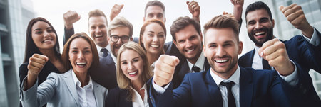 Energetic business team celebrating victory with joyous expressions and raised fists