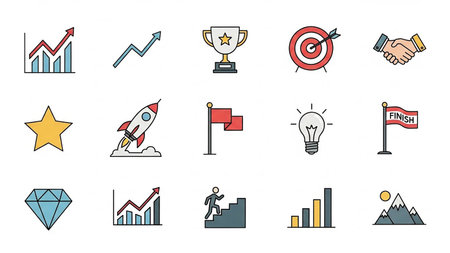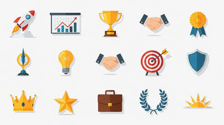 A vibrant collection of flat design icons representing business concepts like startups, growth, awards, ideas, partnerships, goals, and success on a...