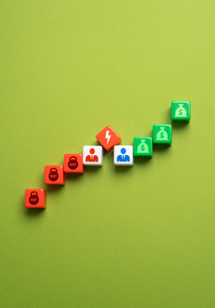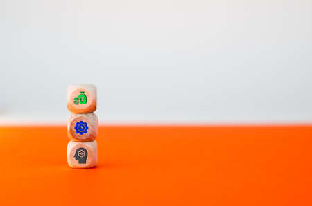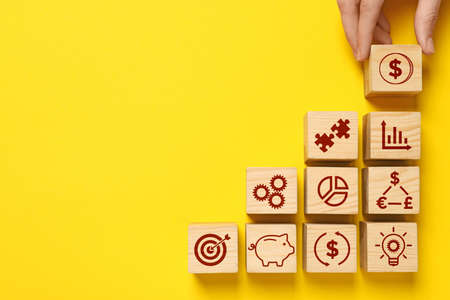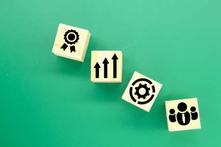 wooden cubes with the Growing Achievement icon Teamwork Management. Growing Business