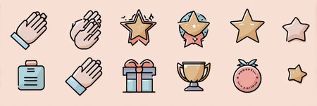 A collection of icons showcasing hands clapping, stars, gifts, and trophies, ideal for conveying themes of achievement and recognition in a vibrant style.