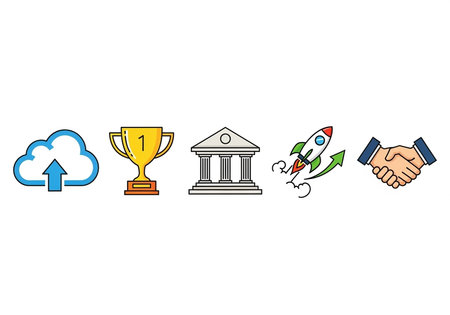 Line icons representing cloud upload, trophy, building, rocket, and handshake.