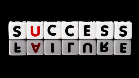 Success spelled in dice letters with failure reflecting below Isolated on black background