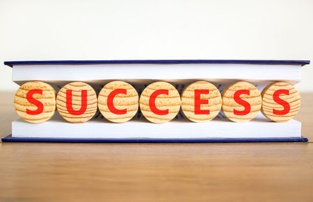 Successful success symbol. Concept word Success on beautiful wooden circles in book. Beautiful wooden table white background. Business success or successful concept. Copy space.