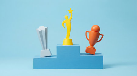 A vibrant image showcasing three trophies of different designs placed on a blue podium, symbolizing victory and recognition.
