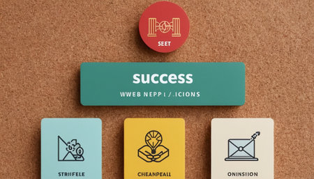 Business concept image of success word with icons on business cards over cork board