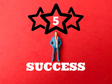Miniature people and icon with text SUCCESS on red background.