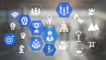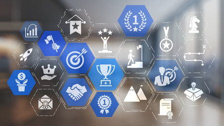 Achievement and Business Goal Success conceptual - Creative business people with icon graphic interface showing employee reward giving for business success achievement.