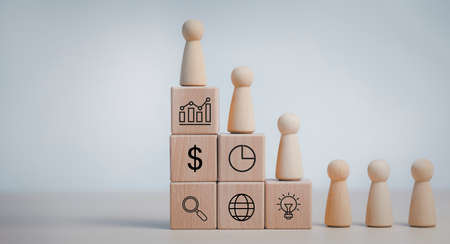 Winners figures on pedestal and losers on floor, Business hierarchy, ranking, wooden doll woman walking up stack cubs wood with Action plan, Goal and new target, success and business target concept,