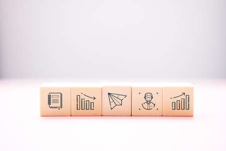 Wooden cubes in a column with icons of startup stages. Concept of business strategy and action plan