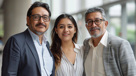 Young hispanic woman with aged colleagues image, ai generated. Latin american corporate employees group in office photography scene wallpaper. Commercial success concept photorealistic photo