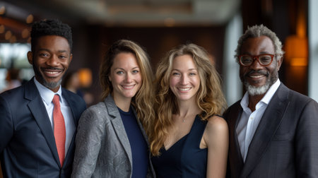 A diverse group of business professionals stands together in a modern office, dressed in formal attire, posing for a photo.