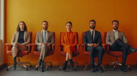 Five professionals seated in a modern office with orange walls during a business meeting, showcasing diverse attire and expressions