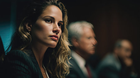 A thoughtful woman in a business meeting captures the essence of professionalism with her intense expression, surrounded by focused colleagues in a corporate setting.