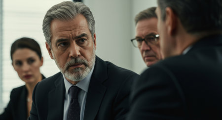 A collaborative scene featuring focused discussions among corporate executives in a professional setting