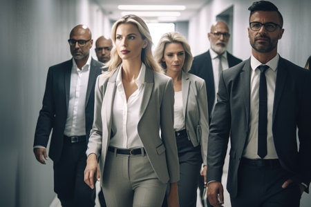 shot of a group of confident businesspeople walking together in a hallway, created with generative ai