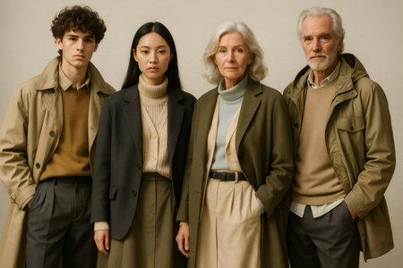 Four fashion models wearing layered autumn clothing in various shades of green, brown, and beige, posing together against a neutral background