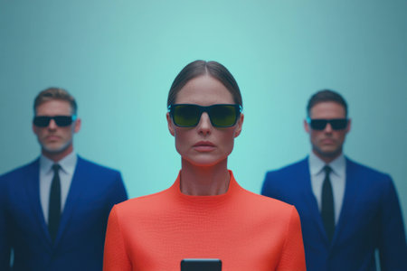 Confident businesswoman in an orange outfit with sunglasses, flanked by two men in dark suits, showcasing a futuristic corporate vibe