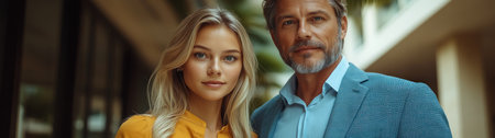 A couple stands close, smiling warmly in stylish outfits against an elegant backdrop.