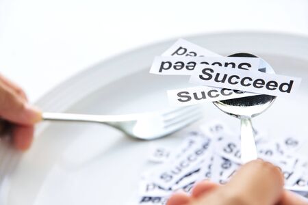 Feed your need to succeed. a group of young businesspeople holding letters that spell out the word succeed.