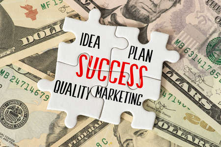 Dollar bills and puzzle pieces with the words success, idea, plan, quality and marketing