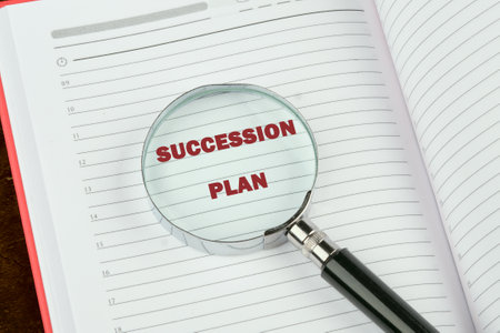 SUCCESSION PLAN word alphabet letters through a magnifying glass on a blank page of a notebook, a book
