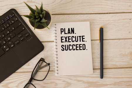 Action Plan Plan, Execute, Succeeded writing on notebook. Notebook on desk with coffee cup and a pen.