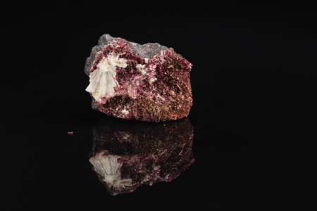 Closeup Photo of Raw Crimson Erythrite Mineral Gemstone on Black Background with Reflection