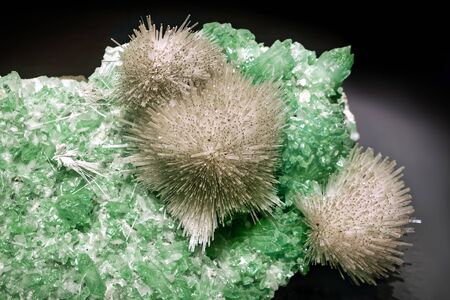 Close-up view of fibrous mesolite crystals located on green fluorapophyllite crystals