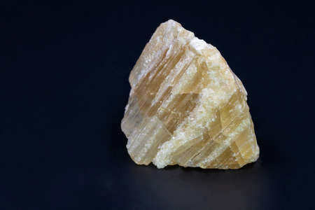 a piece of the mineral calcite, a stone made of calcite rock, a layered structure of a calcite stone from the Caucasus Mountains close-up on a black background, copy spase