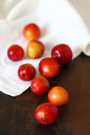 Plum fruit red orange scattered on wooden old scratched brown tabletop and beige crumpled tablecloth.