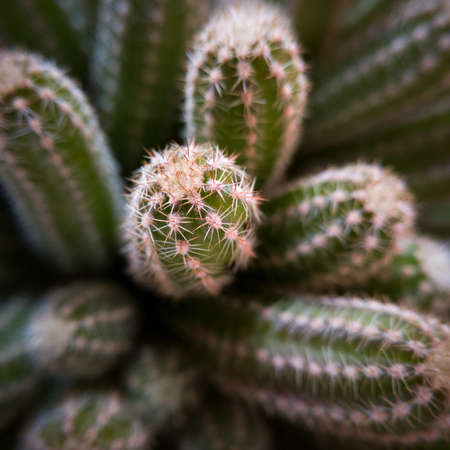Close-up of the top of an exotic green prickly cactus with a blurred background.