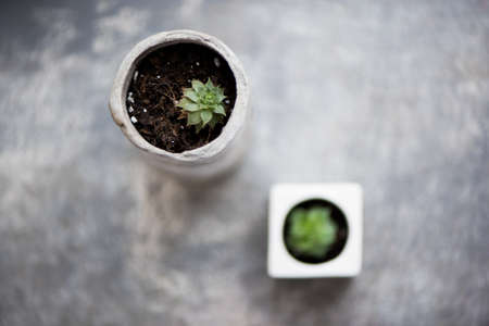 Succulent green plant on concrete background. Plant home decoration with natural light, flat lay.