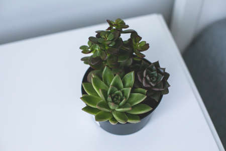 Tiny succulents in pot on bedside table in the bedroom in scandinavian style home