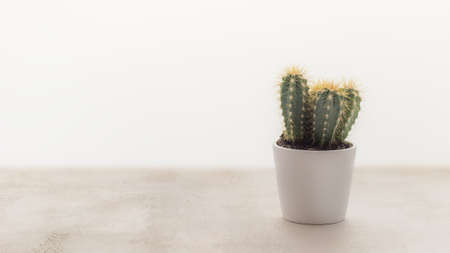 Horizontal flower composition with cactus in a round pot on a light background with a copy space. Home decor and gardening concept. Hobbies growing home plants and gardening apartments