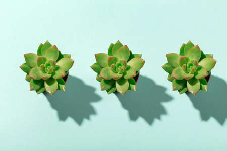 Modern banner or header with succulent plants on mint paper background. Minimal flower concept in hard light with shadow. Abstract backdrop. Top view, flat lay, minimal nature background.