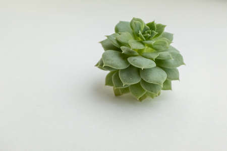 Light green succulent rosette on light background, close-up. Side view on echeveria plant with thick funny leaves for publication, poster, calendar, wallpaper, website, space for your design or text