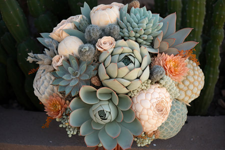 a vintage-inspired bouquet featuring a variety of unique and unusual blooms, such as succulents, cacti, and tropical flowers., created with generative ai
