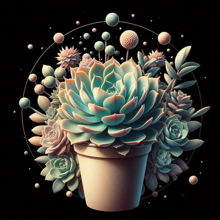 An AI generated illustration of a collection of potted plants artfully arranged in a circular pattern against a striking black backdrop