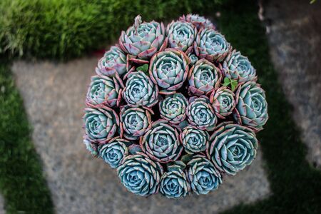 Succulent garden houseplant top view, colorful green, pink, blue and purple color small flower bouquet arrangement. Blossom home decor design close up