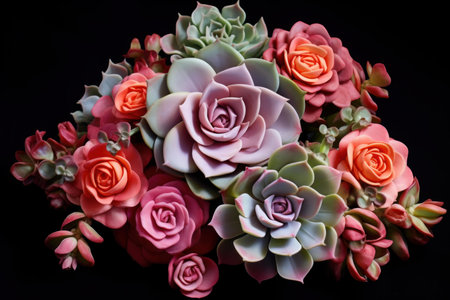 A stunning arrangement of colorful succulents and vibrant orange roses set against a dark background, perfect for modern decor and botanical art.