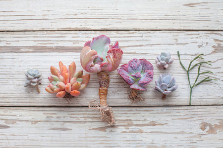 Beautiful succulent echeveria flowers on white vintage wooden background