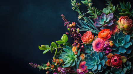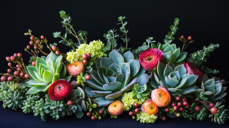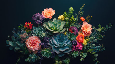 This stunning floral arrangement features an array of vibrant flowers and succulents, beautifully contrasting against a dark background, perfect for decor or inspiration.