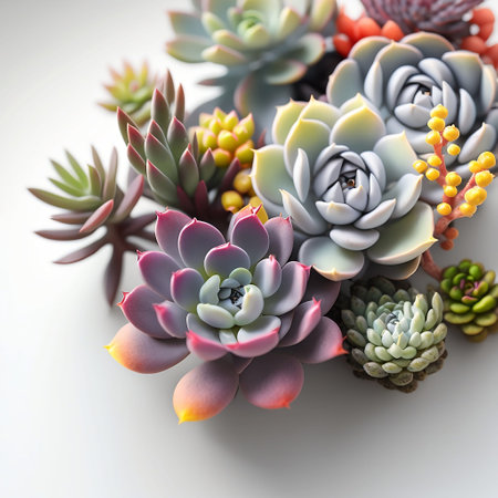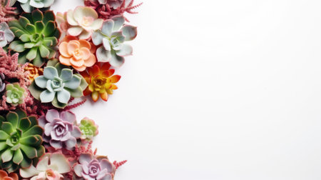 Colorful succulents on a white background with space for text