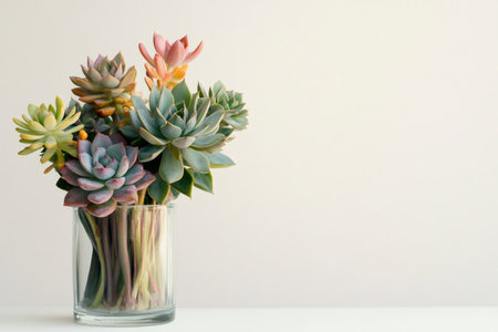 Colorful succulent plants arranged in a clear glass vase, creating a vibrant and natural display against a minimalist white backdrop