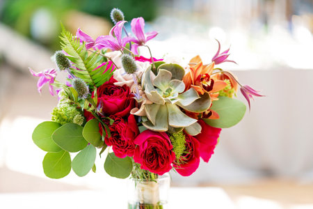 Bridal bouquet. Beautiful Bouquet of flowers of roses, succulents, orchids and thistles. Wedding decorations. Soft selective focus.