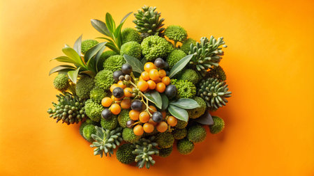 A vibrant circular arrangement of green succulents and small yellow and purple berries on a bright orange background.