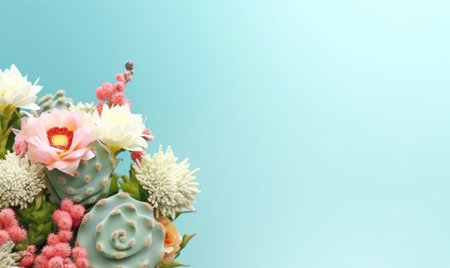 Vibrant bouquet of various flowers and succulents against a serene blue backdrop, symbolizing nature diverse beauty. AI Generative