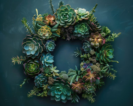 A stunning wreath crafted from a variety of succulents, set against a vibrant blue background, creating a visually striking and serene display.