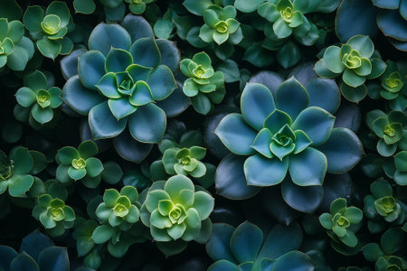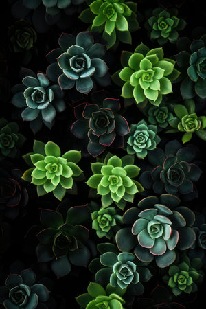 Vivid succulent plants in close up top view, creating a vibrant macro background texture