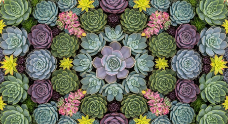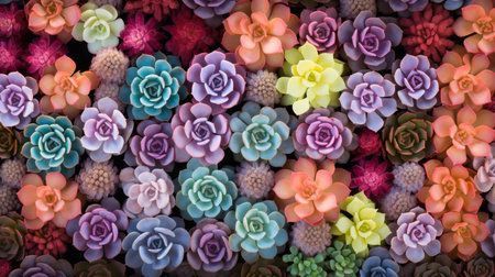 A visually appealing arrangement of various succulent plants in different colors and shapes, creating a beautiful pattern. The succulents are densely packed, showcasing their unique textures and hues.